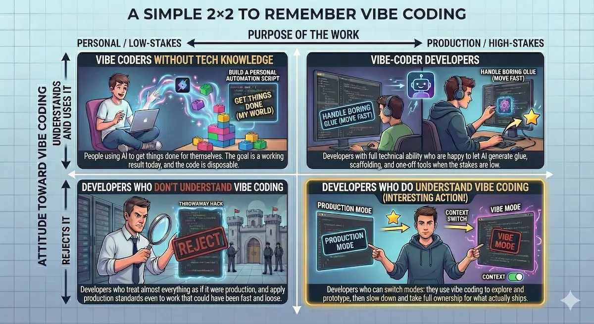 Most of the interesting action is in quadrant 4: developers who operate in production but still understand why low‑stakes vibe coding (quadrants 1 and 2) is legitimate. Generally speaking, if you are a developer rejecting vibe coding, it is probably because developing is only a job for you, you don't do experiments outside of work and side projects.